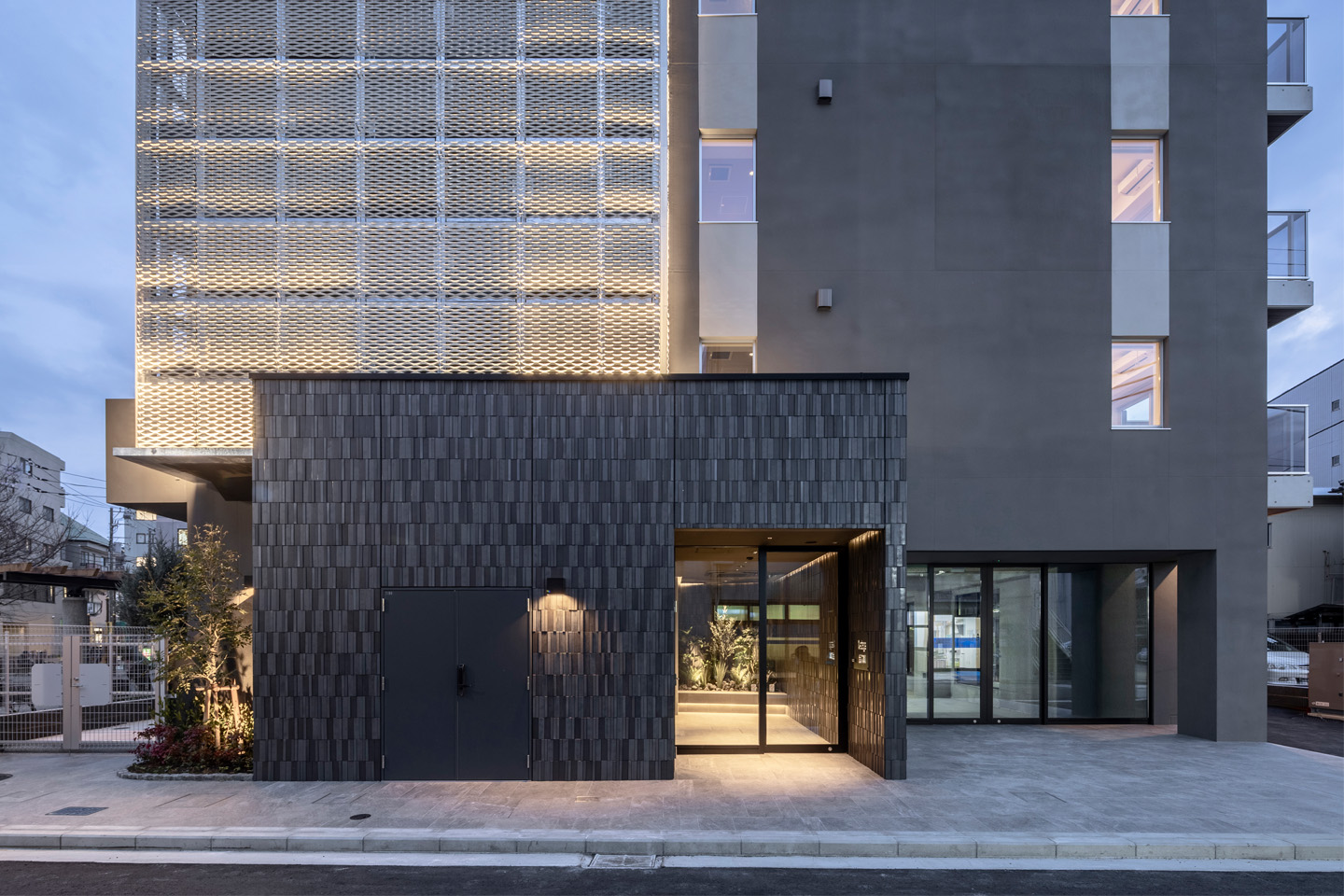 道路に面する屋外避難階段はエキスパンドメタルで包み、開口率と色調にグラデーションを与えることで、低層部ではプライバシーに配慮した遮蔽性を確保しつつ、上層部では軽やかに空へ溶け込むようなファサードとしています.